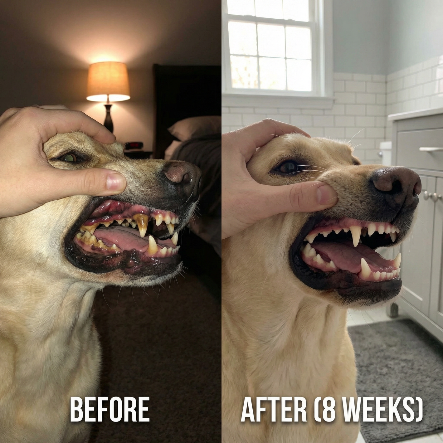Most owners notice fresher breath within 2-3 weeks. Gums start healing around week4. Full results - cleaner teeth, healthy gums, fresh breath - typically by 8-12 weeks.