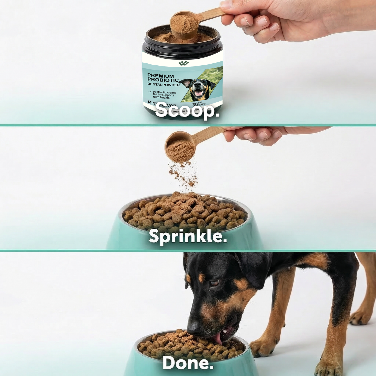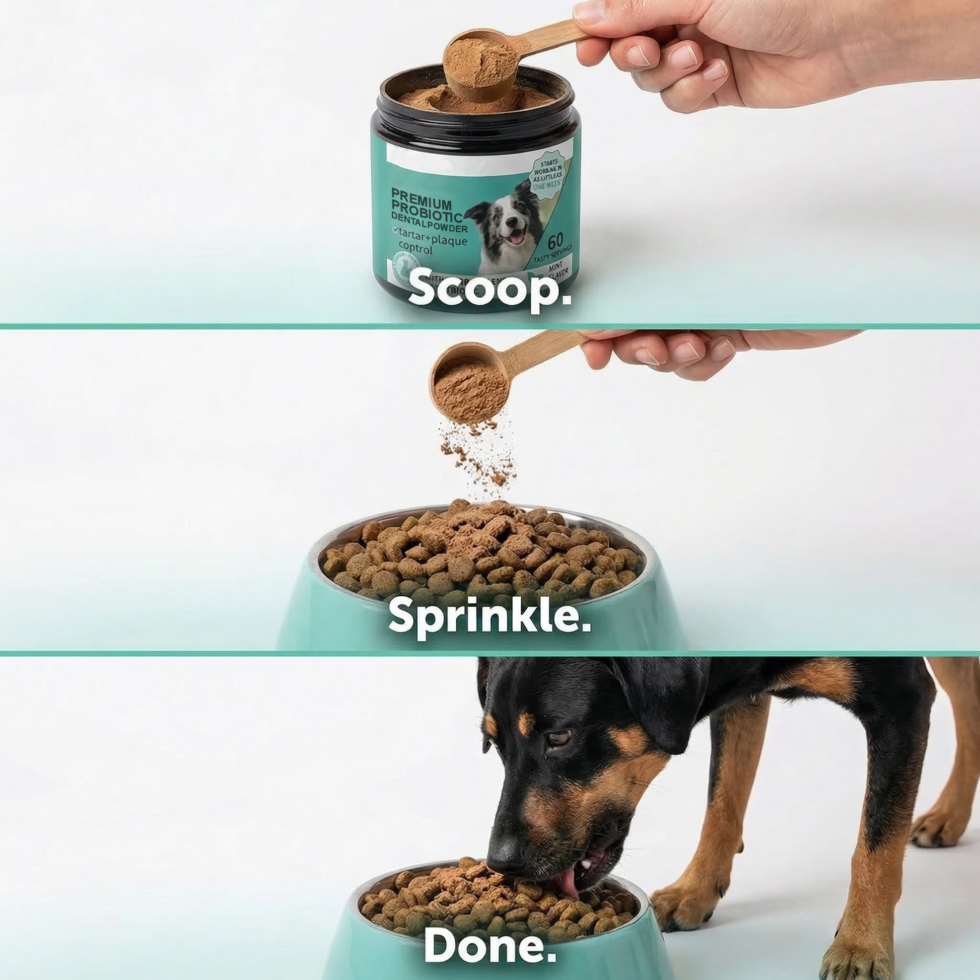 Instead of cleaning teeth for a few minutes, it changes thebacterial environment in your dog's mouth around the clock.The powder dissolves in their food and works through their saliva- the same saliva that touches every tooth surface constantly.Bad bacteria can't thrive. Gums heal. The cycle breaks.