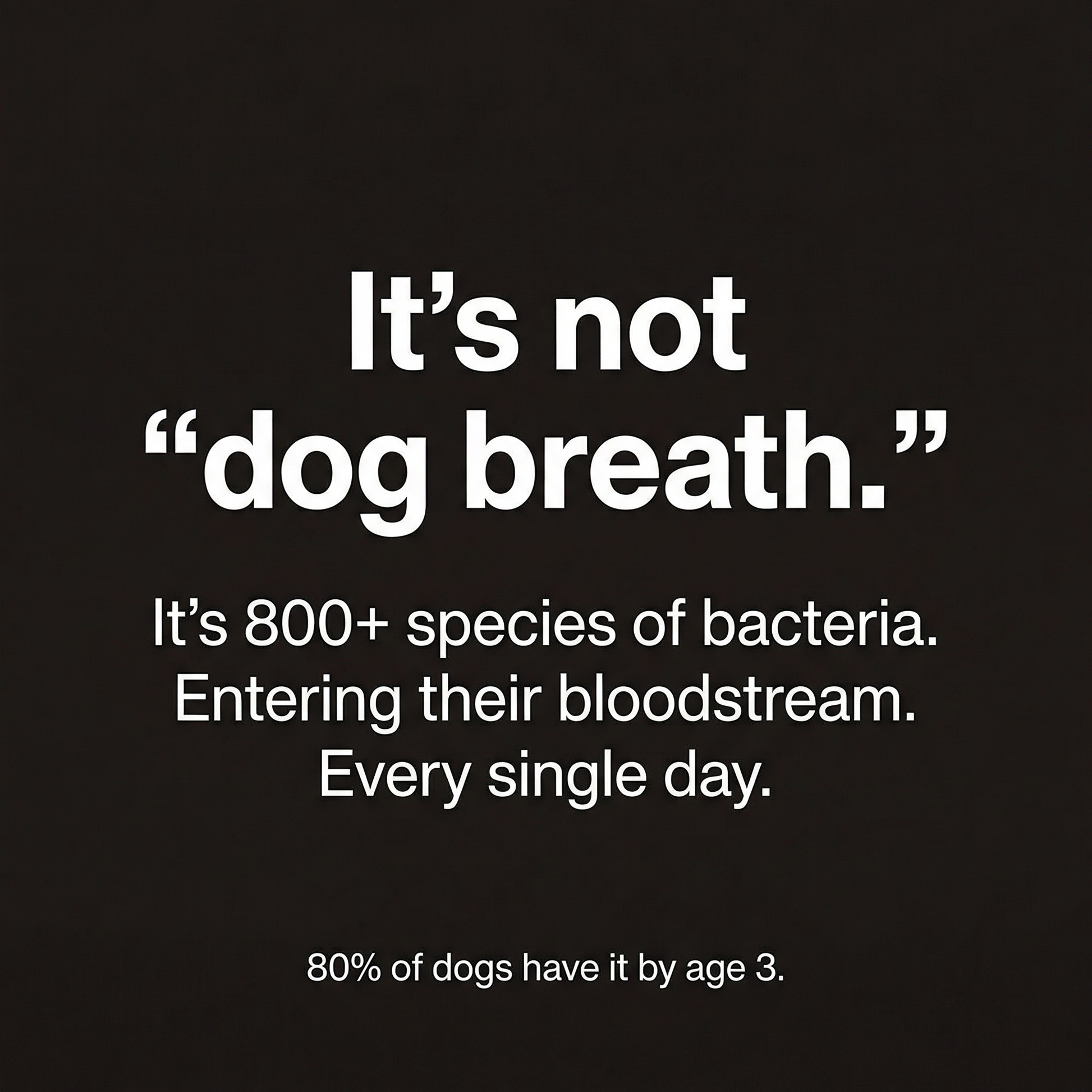 Bad breath isn't just a smell problem - it's gingivitis. Bacterial infection inthe gums that bleeds into the bloodstream every time your dog eats. Ourformula targets the infection at the source with 4 clinically-backedingredients that work 24/7 through saliva.