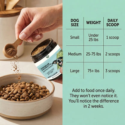 step 1: Sprinkle one serving (depending on size of your dog) onfood (breakfast or dinner)